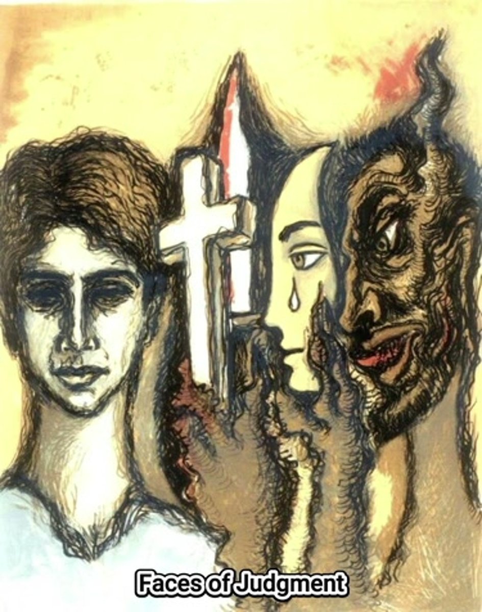 This emotionally charged and psychologically layered painting by Sadequain portrays the internal and external conflict between innocence, sorrow, and evil. Three starkly different faces emerge from a blurred and textured background: on the left, a young man with a calm but somber expression; in the center, a sorrowful face marked by a tear; and on the right, a grotesque, almost demonic figure with a twisted smile. Between them rises a white cross, outlined in red and black—a symbol that invokes spiritual judgment, morality, and the weight of conscience. It cuts through the composition like a verdict, dividing the faces yet tying them together in shared space. The clean simplicity of the young man’s face contrasts with the heavily rendered chaos of the devilish figure, while the weeping middle face—perhaps a soul caught between them—adds a deeply human element of pain and empathy. Sadequain explores not just good and evil as abstract forces, but their presence within the self. This is not a battle between people—it is a battle within. The smudged transitions between the faces and the haunting textures reflect the blurred lines between virtue, guilt, and temptation. Faces of Judgment is a mirror held up to the soul, challenging viewers to recognize the shifting personas they carry, and the quiet wars they fight within.