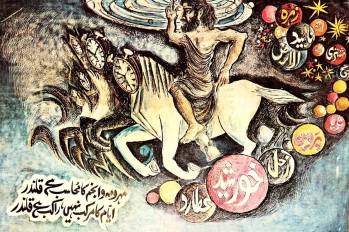 In this dynamic and symbol-laden painting, Sadequain explores the metaphysical struggle between human agency and the forces of time, fate, and cosmic law. A powerful figure—bare-chested and determined—rides a surreal, mythic horse adorned not with eyes, but with clock faces, each one marking a moment in the relentless march of time. The rider, carrying a celestial spiral above him, seems to defy gravity, poised in motion yet burdened by the vast machinery of the universe. Surrounding the figure are circular orbs inscribed with celestial and spiritual concepts: Shams (Sun), Qamar (Moon), Zuhal (Saturn), Ruh (Soul), Aql (Intellect)—all floating in a cosmic space alive with stars, swirls, and calligraphic energy. The text in Urdu poetically questions whether man is merely subject to the mechanics of the heavens or if he possesses the power to transcend it. Sadequain’s visual language here is explosive yet controlled, filled with philosophical urgency. The horse—half real, half symbolic—represents the vehicle of human will navigating the timeline of existence. Time is not just measured, it is felt, seen, and ridden. Through this profound visual metaphor, Sadequain poses a timeless question: Are we passive observers in the universe, or active riders of our own fate?ORDERING INFORMATION Medium: Canvas Dimensions: – Small (16 inch to 30 inch X corresponding dimension as per aspect ratio) – Medium (30 inch to 48 inch X corresponding dimension as per aspect ratio) – Large (48 inch to 60 inch X corresponding dimension as per aspect ratio) Available unframed canvas only. Authenticity and Licensing: All Giclee reproductions are made from Sadequain’s authentic artworks, verified by and under a licensing agreement with SADEQUAIN Foundation. Availability: Print-to-order Shipping: Estimated 2 to 4 weeks Care Instructions: The canvas should be framed without glass. Avoid direct sunlight.