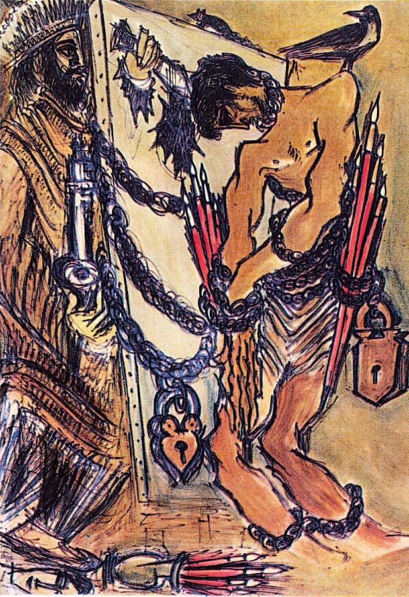 This striking and sorrowful painting by Sadequain serves as a powerful commentary on censorship, repression, and the silencing of creative expression. A naked, hunched male figure—bound in thick black chains and weighed down by heavy padlocks—stands beside a blank canvas. His brushes, the very tools of his art, are tied to him like burdens, no longer instruments of freedom but symbols of control. His head is bowed, evoking both exhaustion and defeat. To the left stands a grim, authoritarian figure clad in regal, perhaps religious or political garb, holding a key—suggesting control over not just the chains, but the fate of expression itself. Behind them, the canvas is torn and scratched, marked by images of torn wings and scattered feathers—a clear metaphor for lost potential, broken spirit, and suppressed imagination. A black crow perched on top adds a chilling sense of surveillance and doom. The visual language is bold and deliberate: red paintbrushes like imprisoned spears, chains shaped like nooses, and a posture that speaks louder than any scream. Through this work, Sadequain lays bare the brutal cost of silencing the artist. Imprisoned Vision isn’t just about one man—it’s a portrait of every soul restrained by tyranny, tradition, or fear. It is an appeal for liberation—not just political, but intellectual and creative.