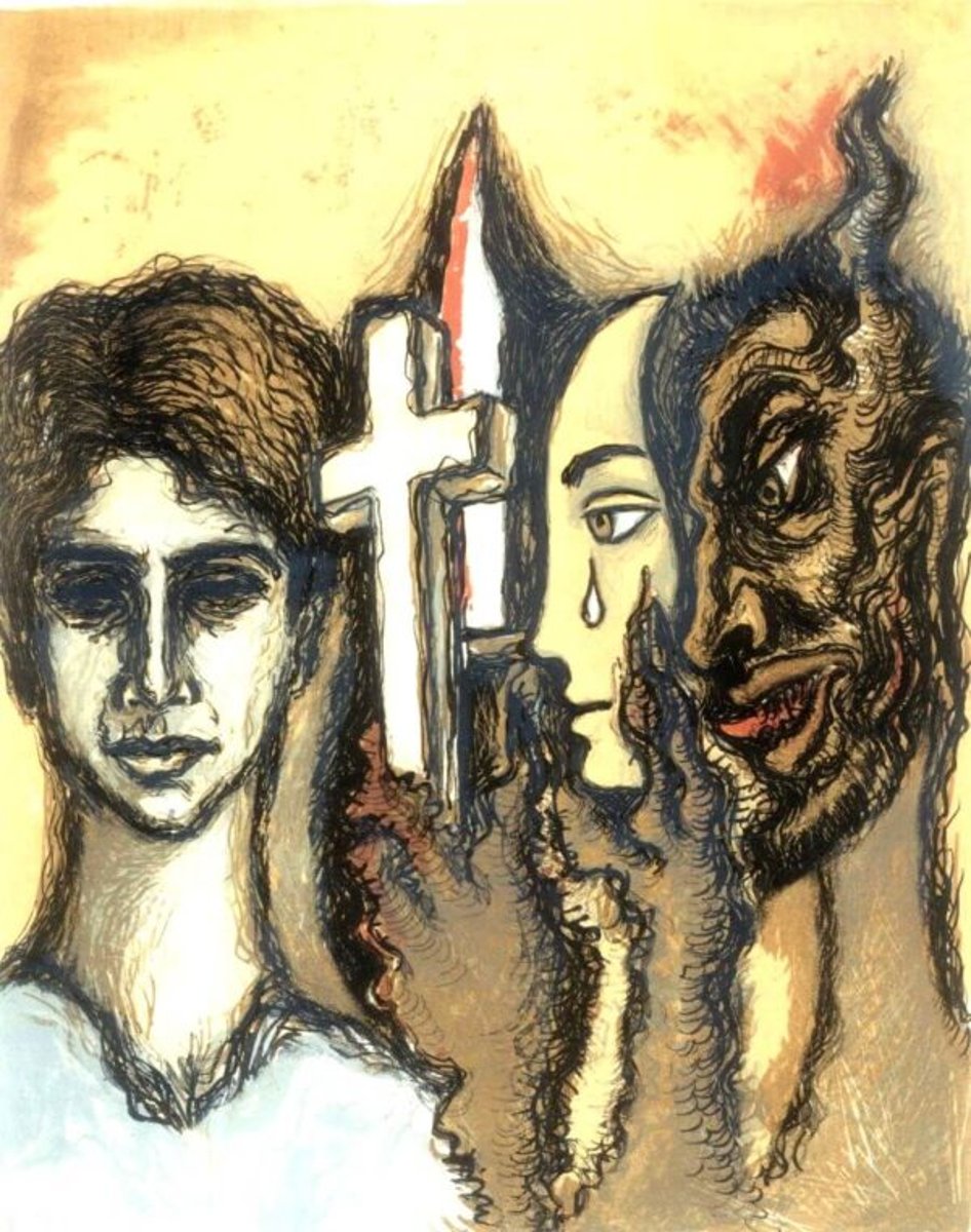 This emotionally charged and psychologically layered painting by Sadequain portrays the internal and external conflict between innocence, sorrow, and evil. Three starkly different faces emerge from a blurred and textured background: on the left, a young man with a calm but somber expression; in the center, a sorrowful face marked by a tear; and on the right, a grotesque, almost demonic figure with a twisted smile. Between them rises a white cross, outlined in red and black—a symbol that invokes spiritual judgment, morality, and the weight of conscience. It cuts through the composition like a verdict, dividing the faces yet tying them together in shared space. The clean simplicity of the young man’s face contrasts with the heavily rendered chaos of the devilish figure, while the weeping middle face—perhaps a soul caught between them—adds a deeply human element of pain and empathy. Sadequain explores not just good and evil as abstract forces, but their presence within the self. This is not a battle between people—it is a battle within. The smudged transitions between the faces and the haunting textures reflect the blurred lines between virtue, guilt, and temptation. Faces of Judgment is a mirror held up to the soul, challenging viewers to recognize the shifting personas they carry, and the quiet wars they fight within.