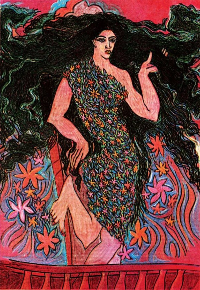 Radiant, unapologetic, and arresting, this vibrant painting by Sadequain presents a powerful female figure cloaked in a dress made of blooming flowers, standing defiantly against a backdrop of flaming petals and bold red skies. Her form, poised and self-assured, is framed by wild, flowing black hair that merges with the floral and fiery motifs, symbolizing nature, sensuality, and strength in full bloom.