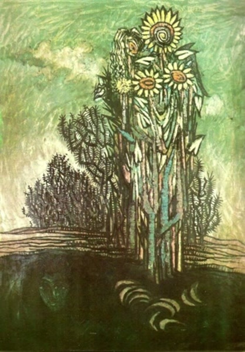 In this evocative painting, Sadequain transforms a familiar symbol of life and vitality—the sunflower—into a complex meditation on resilience and decay. Rising from a dark, almost subterranean base, a cluster of sunflowers emerges atop a tree-like structure, their brightness contrasting with the thorny, brooding vegetation that surrounds them. The forms are angular and layered, giving the composition a sense of tension between growth and confinement. Beneath the surface, ghostly outlines and crescent shapes hint at buried truths or cycles of regeneration. Set against a moody green sky, the work reflects on the persistence of beauty and hope in the midst of adversity, a recurring theme in Sadequain’s visual language. It is both a celebration of nature’s endurance and a somber reminder of its fragility.