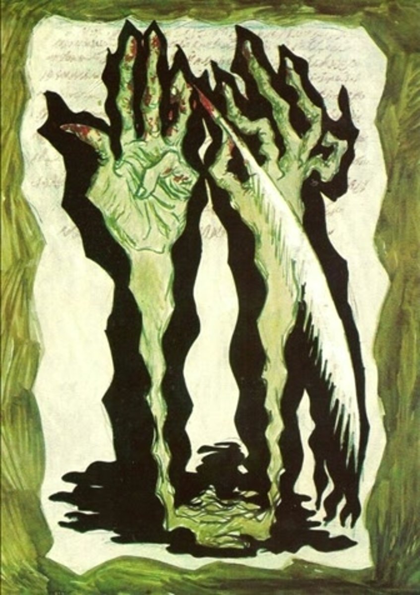 sacrifice. Severed, bleeding hands reach upward—one appearing to write, the