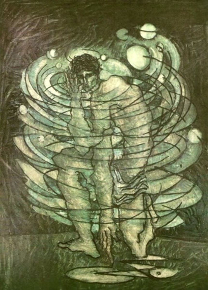 This contemplative piece by Saadayqain portrays a solitary male figure encircled by swirling, celestial forms that echo planetary orbits or cosmic waves. With one hand covering part of his face and the other reaching down to draw or etch into the earth, the figure appears caught between introspection and action, thought and creation. The spiraling lines around him suggest a mental or spiritual vortex—perhaps symbolizing the overwhelming nature of thought, memory, or the universe itself. His form is fragmented yet grounded, evoking a tension between inner complexity and outward stillness. Painted in cool, ethereal tones of green and blue, the work creates a sense of suspended animation, as if time itself has slowed around this moment of philosophical inquiry. A poetic meditation on the human condition, it captures Saadayqain’s fascination with man as both a creator and a questioner of his place in the cosmos.