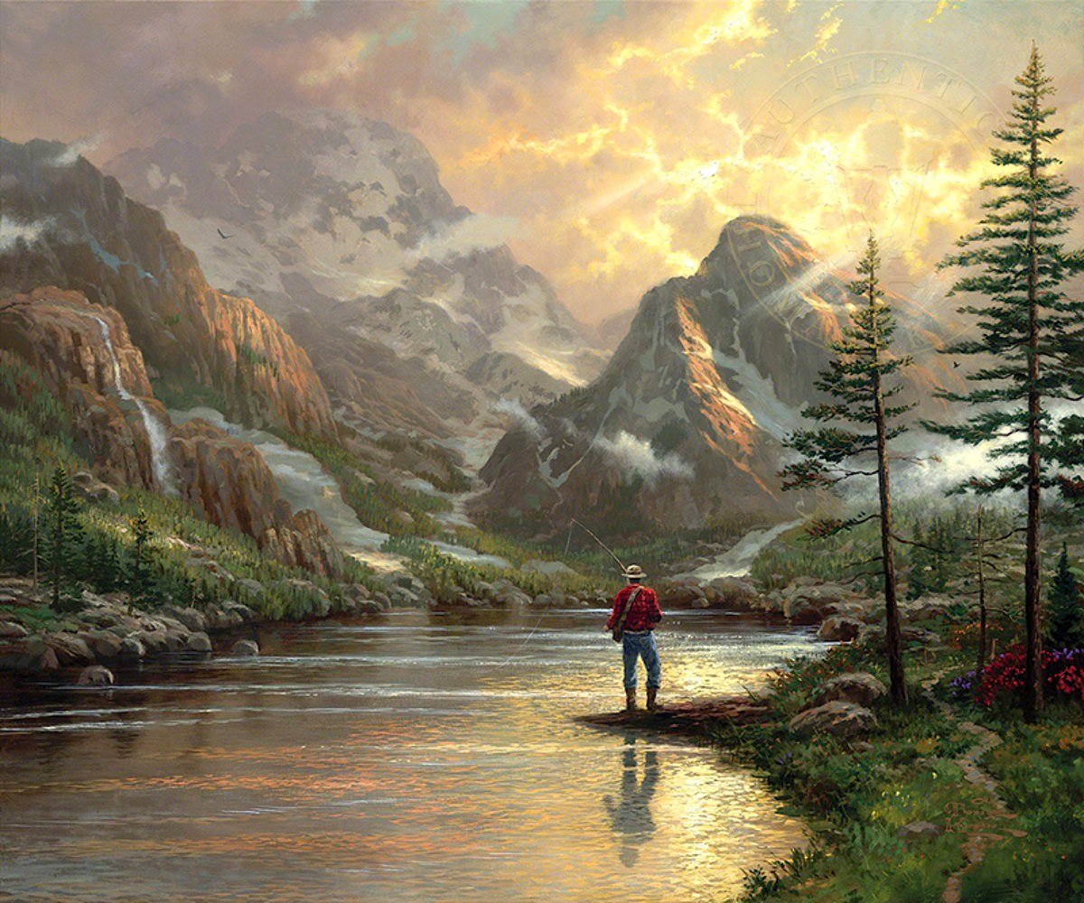 When I reflect on how much time we spend in our homes and offices, or hurrying here and there in planes and trains and autos – wrapped, always, in cocoons of our own making – I am dismayed. We need to break free from our self-imposed isolation and open ourselves to the healing power of God’s glorious creation. Nothing restores the spirit quite like a breathtaking mountain vista. It just doesn’t get much better than it is for this fisherman, who has tramped through the woods, rod in hand, to discover a glacial lake where he can fill his creel with plump rainbow trout. I love to fish, not so much for the strike or the catch, but simply because fishing gives me license to get out into nature. A haven such as this, I believe, truly is Almost Heaven. The fisherman seems insignificant among so much grandeur; yet, bathed by the radiant glow of sunset, he is intensely a part of the scene. Like him, we are at once humbled and exalted by immersion in nature.