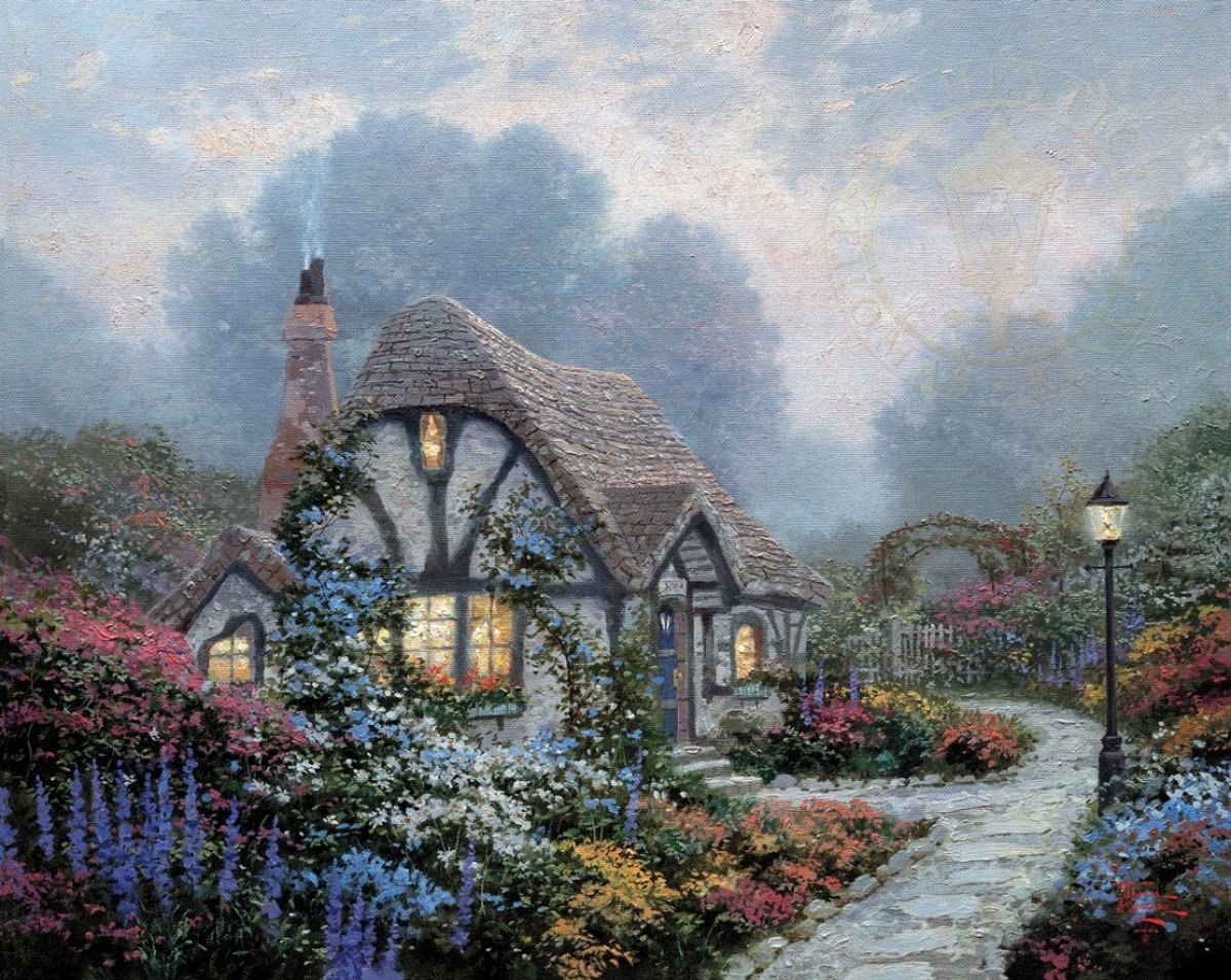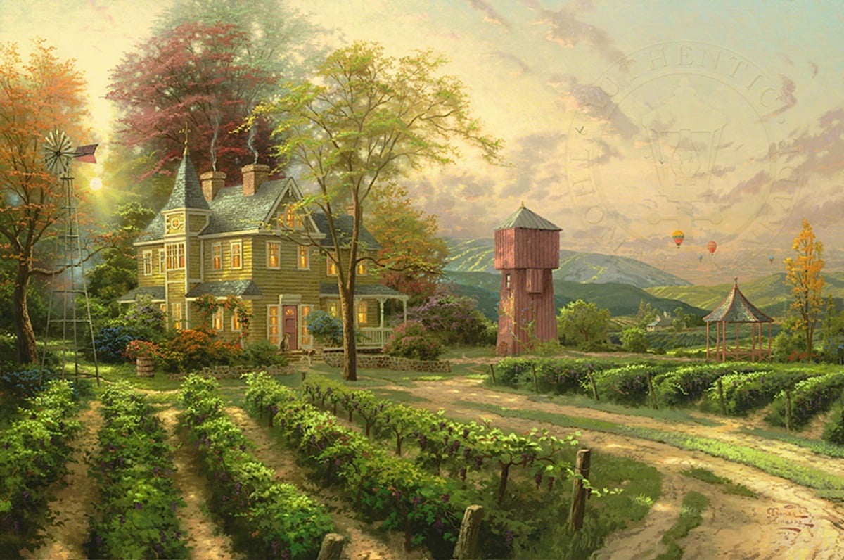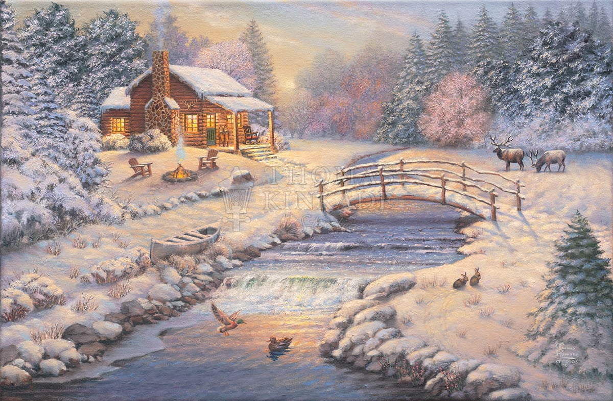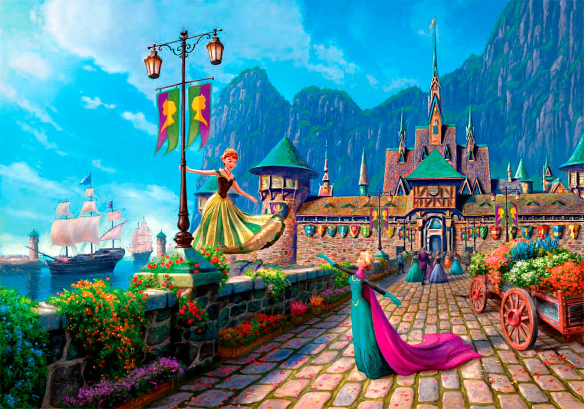 In Disney’s Frozen, the kingdom of Arendelle had sadly lost their regents when the sailing vessel they were on sank in a ferocious storm. The country’s time of mourning has passed, and the kingdom of Arendelle has invited everyone, near and far, to join them in celebrating the coronation of the eldest daughter, Princess Elsa. A grand one-day fête has been planned, and the kingdom has been festooned with colorful flowers and flags. Thomas Kinkade Studios® is pleased to present Disney Frozen Celebration in Arendelle. Disney Frozen Celebration in Arendelle is the second time Thomas Kinkade Studios® has collaborated with Disney to create art featuring moments from this classic film. The first painting was Disney Frozen.