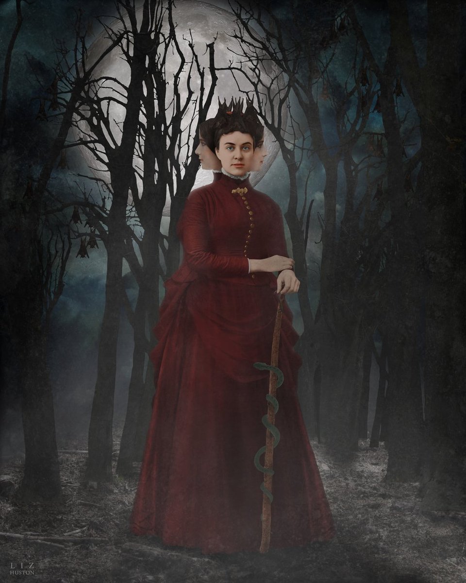 ‘Mother Night’ is in honor of Hekate, Gatekeeper of the crossroads, the original trinity, the Triple Goddess representing 3 traditional phases of a woman’s life, (maiden, mother and crone). She is sacred to the occult, magic and the night. She is strong, powerful, and an ally to witches. In the stories, it is she who assisted Demeter in her lamenting search for Persephone, guiding her through the underworld, leading the to reunion of mother and daughter. (This piece was reimagined as The Hierophant in The Dreamkeepers Tarot)