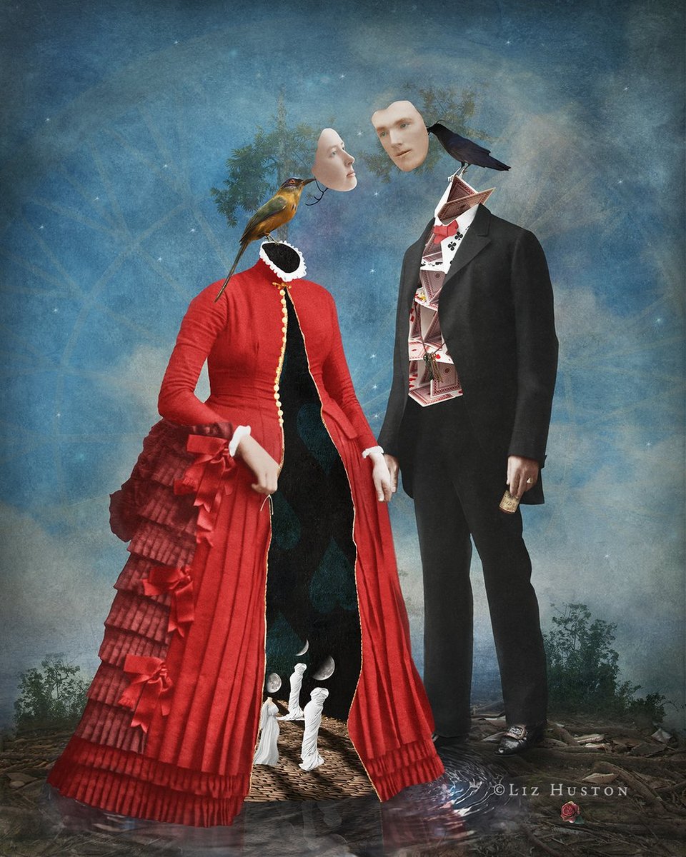 August 2013 In an unguarded moment, two lovers reveal to one another their truest, innermost selves. She reveals her allegiance to the mysteries of existence, the effects of which are subtle and not totally within her control. He admits to a sense of feeling like a house of cards, and is a bit more fragile than he lets on. In their beaks, messenger birds hold the faces of the two lovers, tokens of their identities, almost an afterthought, for they are not nearly as important as the soul bond which has been forged.
