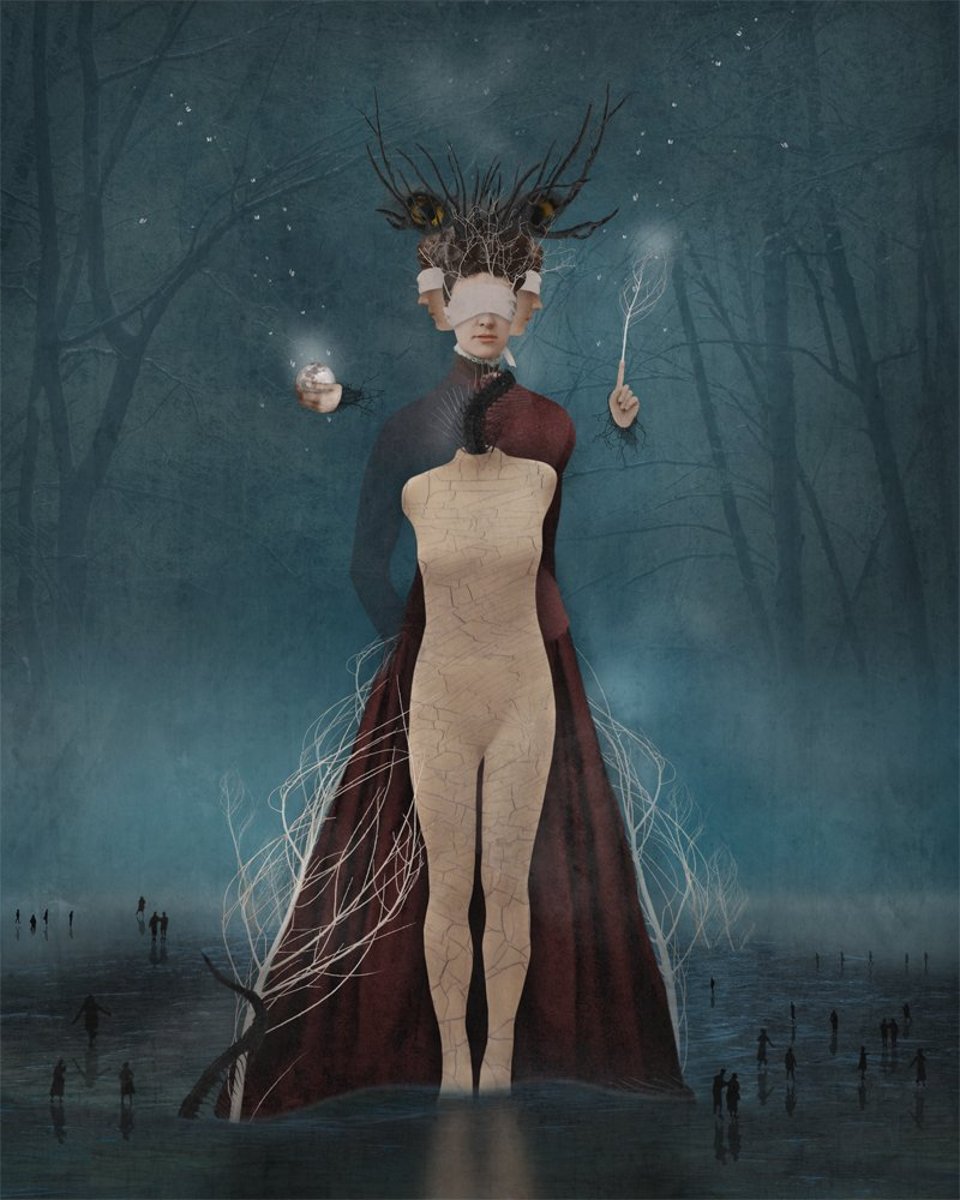 November 2014 Sometimes we wear our pain like a blindfold so that we never need look beyond it. If we wish to step beyond this pain, there comes a time when we must ignore the hungry ghosts lapping at our heels and borrow eyes in order to see. (This piece was reimagined as the 2 of Swords in my Dreamkeepers Tarot)