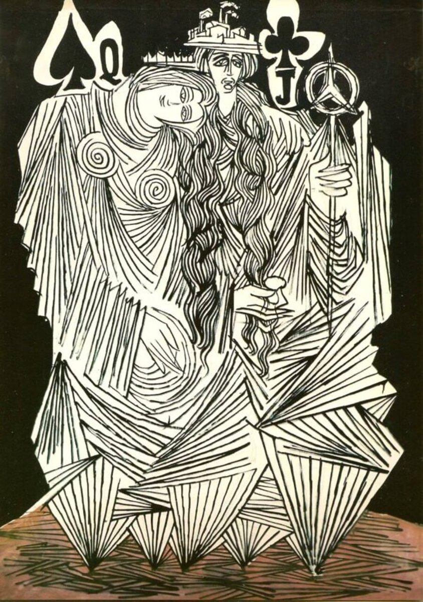 In this intricate black-and-white composition, Sadequain reimagines traditional playing card icons as surreal, almost mythological figures. A crowned woman—part Queen of Spades, part divine guardian—stands beside a figure marked as the Jack of Clubs, both entwined in angular forms and flowing lines. The Queen bears a city on her head, possibly symbolizing civilization, burden, or dominion, while the Jack holds a stylized peace symbol, hinting at a juxtaposition between authority and rebellion, or power and peace. Their bodies dissolve into geometric shards, echoing fractured identities or the abstract machinery of fate and politics. The interplay of linework, symbolism, and distorted anatomy reflects Sadequain’s fascination with societal roles, inner conflict, and the hidden rules that govern human behavior. This is not merely a card game—it is a psychological and philosophical tableau of modern existence.